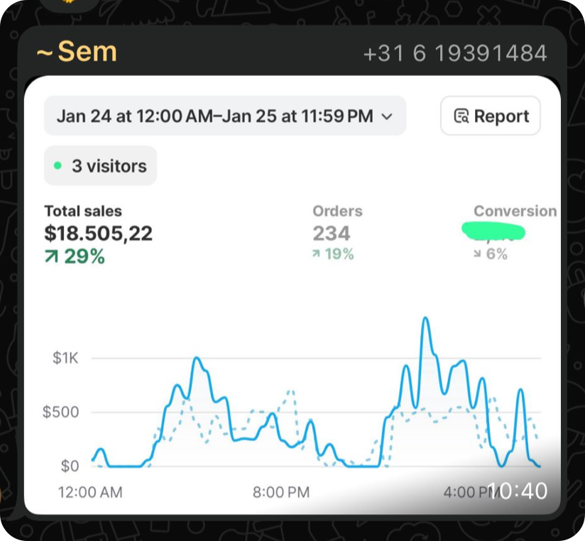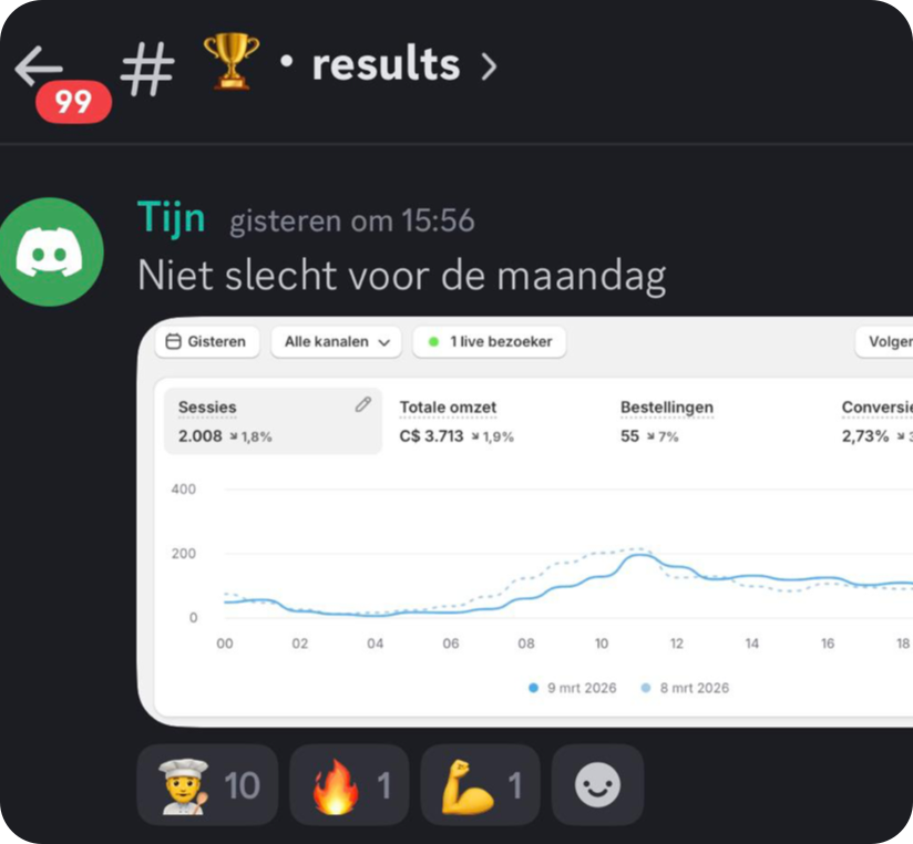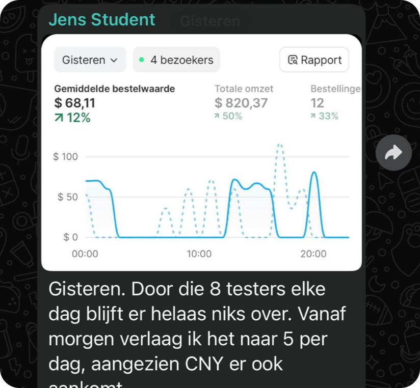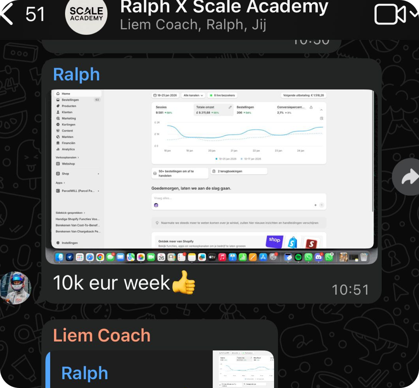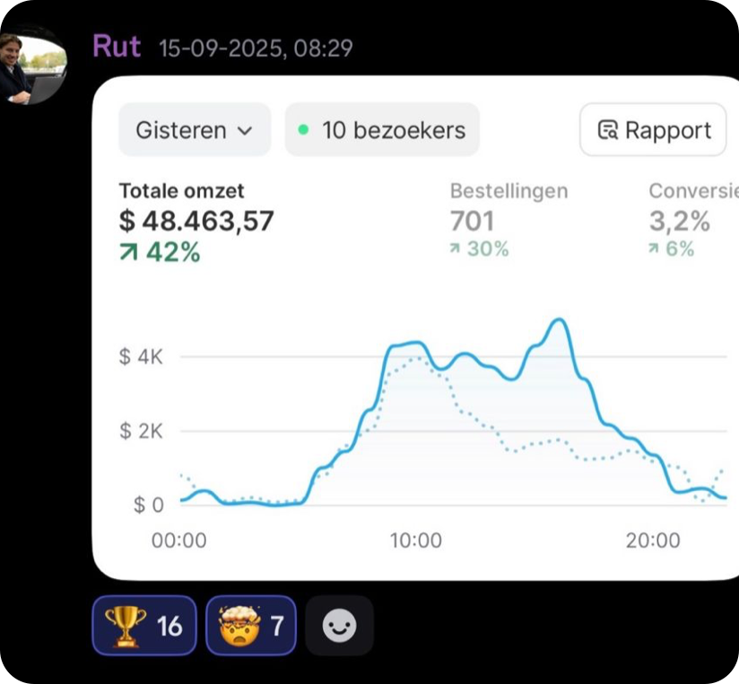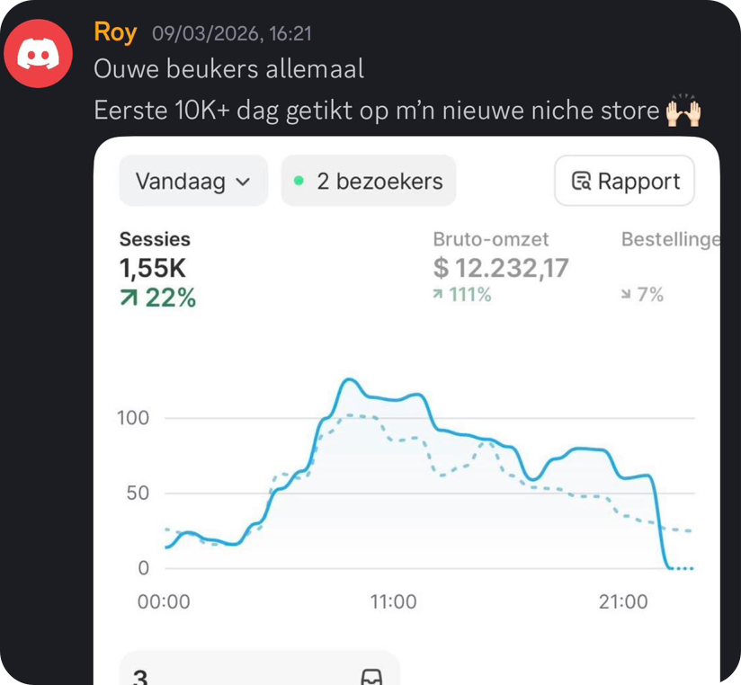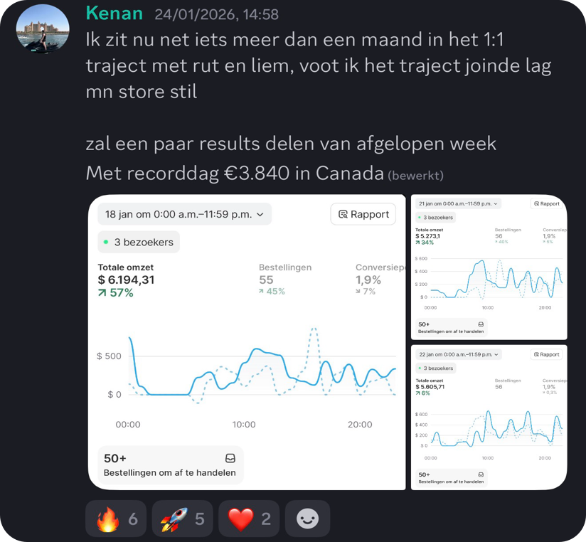 De resultaten hieronder zijn echte resultaten van studenten binnen het traject. Iedere ondernemer start op een ander punt, waardoor resultaten per persoon kunnen verschillen. Iedereen groeit op zijn eigen tempo. De één gaat sneller dan de ander. We zijn pas een aantal maanden live, maar zien nu al mooie resultaten binnen de community. Sommige studenten maken hun eerste serieuze dagen, terwijl anderen al flinke stappen zetten in het opschalen van hun store.